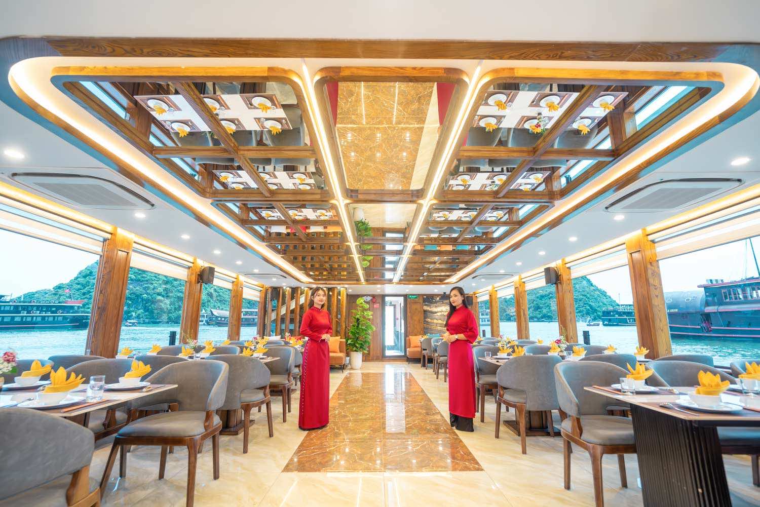11:30 – 13:00 | Premium Lunch: Return to the main boat. Enjoy a delicious lunch featuring fresh seafood and traditional Vietnamese dishes served in the luxury restaurant.